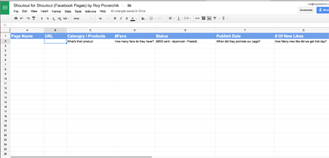 Make a list of Facebook pages that share your target audience. Track responses on a spreadsheet. |